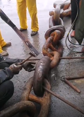 4、用專用機(jī)器夾住惰鏈,再用錨機(jī)把惰鏈放出擺在甲板上,等到另外的連接鏈環(huán)放到甲板上。